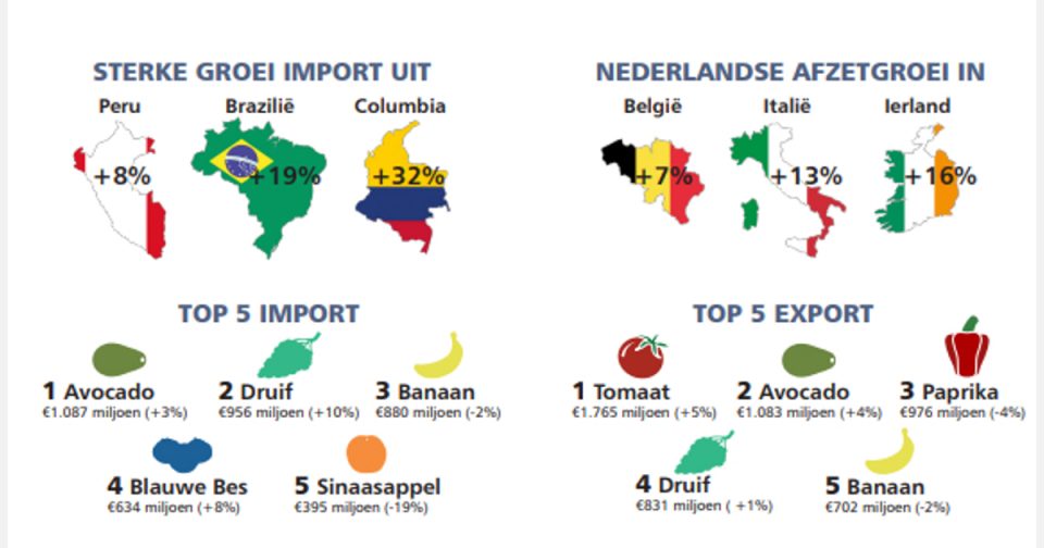 Spain, Peru, and South Africa are the top three fresh fruit and vegetable countries of origin. Imports from Peru, in particular, continue to rise sharply. Between 2016 and 2021, those have more than doubled, reaching €1.1 billion. Peru’s main products are avocadoes, blueberries, and mangoes. Brazil (+19%) and Columbia (+32%) are the biggest climbers for Dutch fruit imports.
