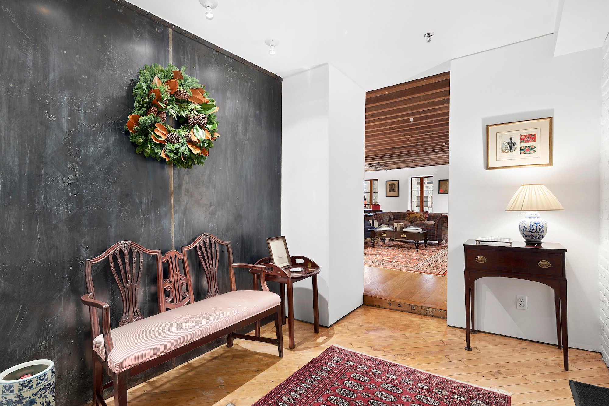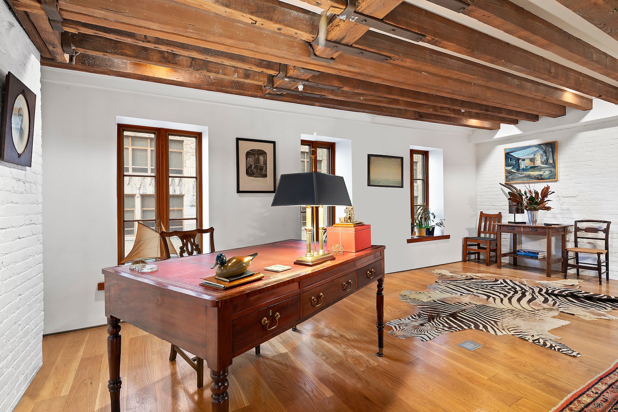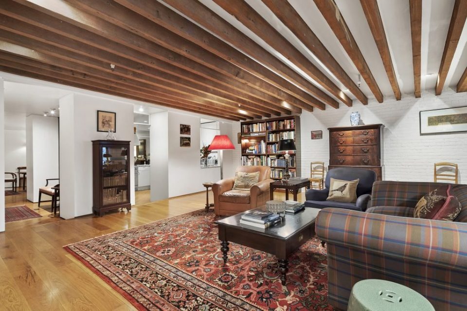 Located at 104 Charlton Street in the burgeoning Hudson Square area, this two-bedroom condo is located in a former printing factory and retains old-world details like wood-beamed ceilings, brick walls, and rustic wood floors. Though there are oversized windows, the 2,000-square-foot home has a cozy, cavernous feel. It also has a charming outdoor terrace, and it’s asking $2,325,000.