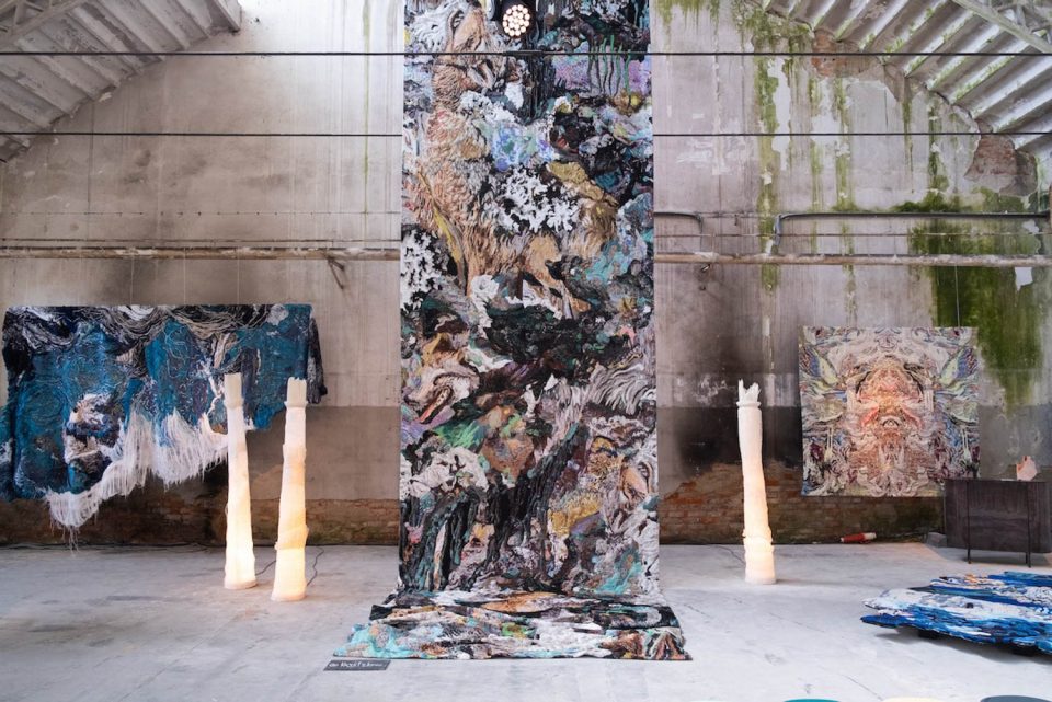 Abstract tapestries by Krjst Studio are illuminated by woven standing lamps by RSLT—treated to stay rigid.