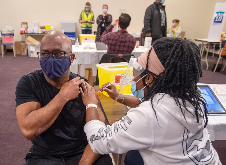 Eugene Anderson gets his shot on April 8 in Upper Hammonds Plains, a community outside Halifax, at the province’s first clinic specifically for Black Nova Scotians.