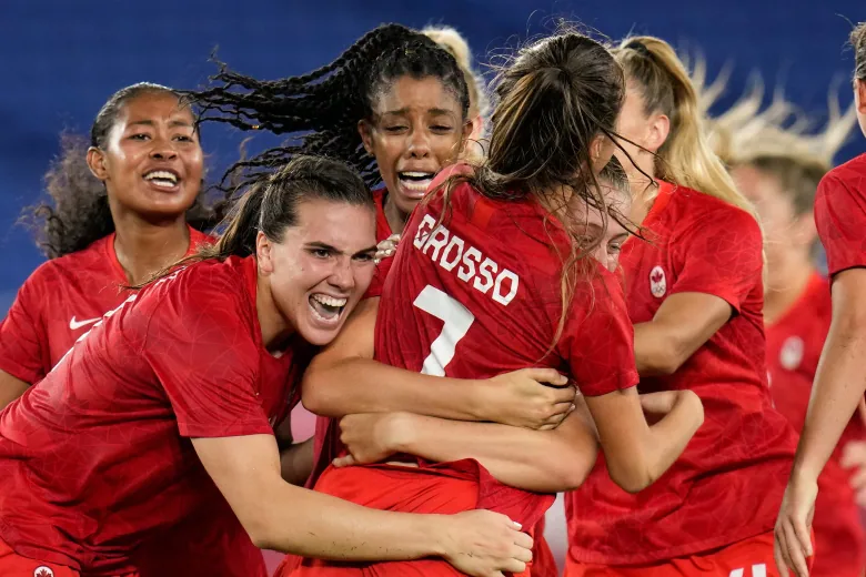 Canada’s Julia Grosso celebrates with teammates after scoring the winning penalty in a shootout against Sweden in the women’s soccer gold medal game on Aug. 6 at the Tokyo Olympics.