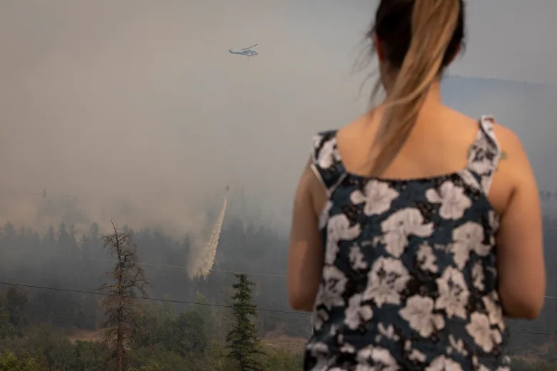 Carli Pierrot, who works for the Skeetchestn Indian Band, watches firefighters working to control part of the Sparks Lake wildfire complex burning on Skeetchestn territory, near Kamloops on July 14. At about 95,980 hectares, Sparks Lake is still considered B.C.’s largest wildfire this season.