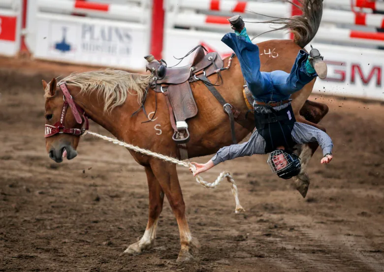 Rider Maesa Morris is bucked off Twilight Moon in the ranch bronc event at the Calgary Stampede on July 14.