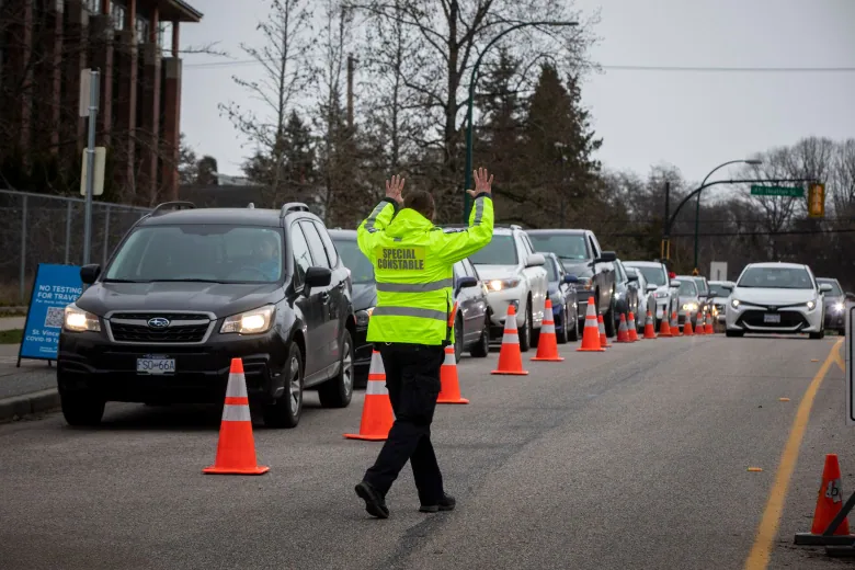 On the same day, cars queue at a COVID-19 testing clinic in downtown Vancouver.