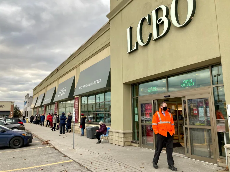 With just days to go before winter holidays, people in Ottawa wait in line at an LCBO for a free COVID-19 rapid test kit on Dec. 17.