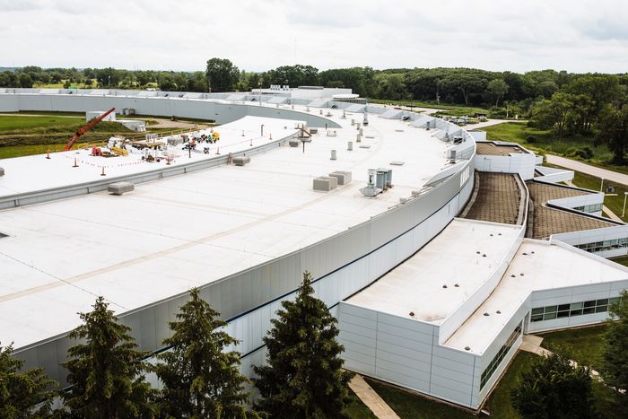 The exterior of Argonne’s massive Advanced Photon Source, which houses X-ray beams that scan all points in a battery.