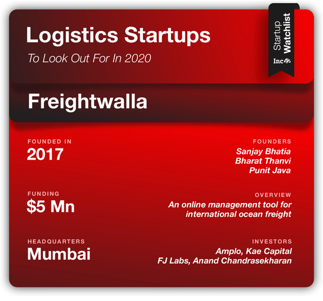 Founded in 2017 and headquartered in Mumbai, Freightwalla is a technology-enabled Indian shipping freight forwarder. The startup claims to focus on addressing inconsistent service levels in the B2B international logistics industry by leveraging technology to offer real-time updates, online documentation services, and consistent pricing.