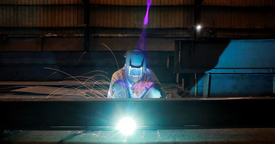 A labourer welds an iron pillar at a building material factory in an industrial area in Dasna, in the central Indian state of Uttar Pradesh, India, January 9, 2019. REUTERS/Adnan Abidi
