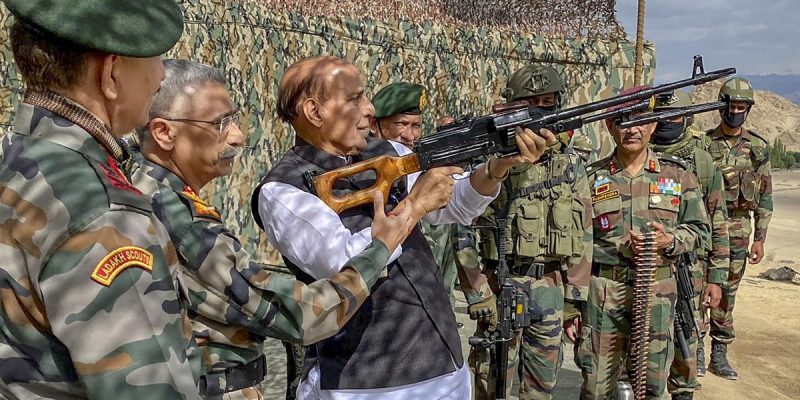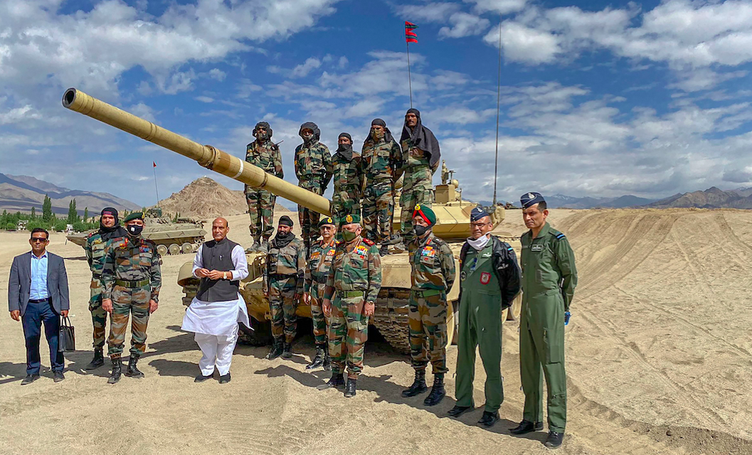 Representative image. Defence Minister Rajnath Singh poses for a group photo with troops who took part in para dropping and other military exercises at Stakna, in Leh, Ladakh, Friday, July 17, 2020. Photo: PTI
