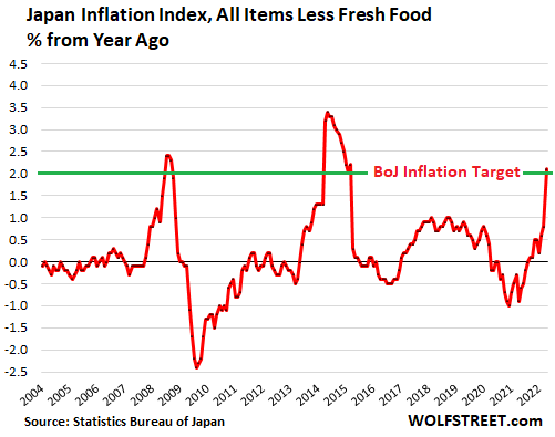 The “All items less fresh food” index is the measure that the Bank of Japan uses for its inflation target of 2.0% — or as it calls this, it’s “price stability target.” The BoJ has been justifying for years its money printing orgy based on this measure having been mostly below 2%. And when it went above 2%, the BoJ blew it off because of what it calls its “inflation-overshooting commitment.” And it says, “With this commitment, the Bank aims to enhance the credibility of achieving the price stability target of 2 percent among the public.”
