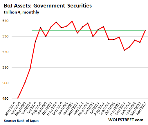 And that’s still the peak, despite a bout of bond buying recently, as part of its Yield Curve Control, to try to tamp down on the 10-year yield that threatened to shoot past the BoJ’s upper limit of 0.25%. So the holdings of Japanese government securities rose in April but remained substantially below the February peak.