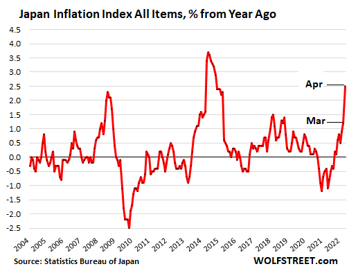The core inflation index – “All items less fresh food” in Japan – jumped by 0.4% in April from March, after having jumped by 0.5% in March, and by 0.4% in February (average of 5.2% annualized). Year-over-year, it jumped by 2.1%.