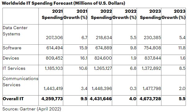 Despite all of our worries about rampant inflation, it doesn’t look like Gartner is expecting abnormal growth in IT spending in 2023 – at least not yet. There is some elevation in the cost of IT services in its model for 2022 and 2023 as the higher costs of IT talent is hitting the market, but it is not anything like the inflation we are seeing in our personal lives for food and gas. The expectation is for overall IT spending to rise by 5.5 percent in 2023 to $4.67 trillion.