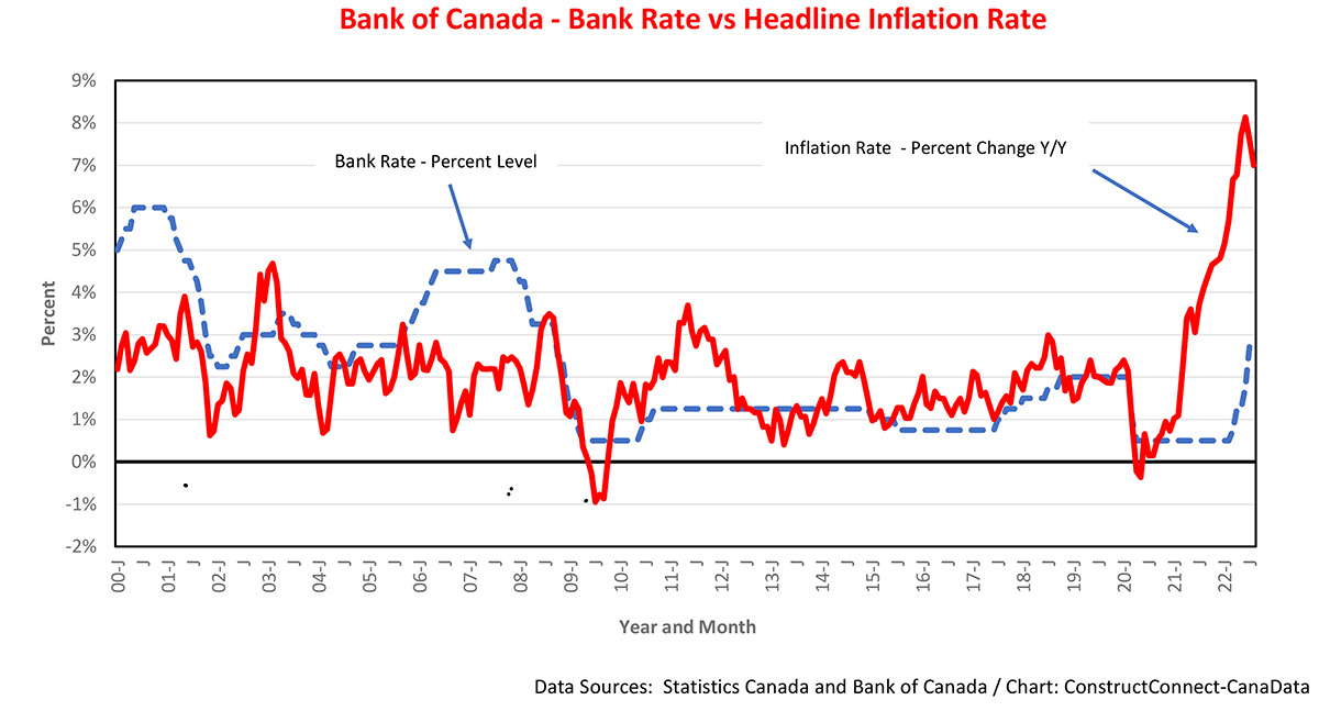 Between January of 2021 and January of this year, inflation in Canada accelerated from +1% y/y to +5.1%. However, monetary authorities remained on the sidelines and did not tighten monetary policy by raising short-term interest rates. They assumed the world would normalize and that inflation would return to its +2% target once excess demand eased off and the supply chain issues caused by COVID dissipated. Instead, strong growth of hiring and persisting supply chain problems pushed the inflation rate to a 30-year high of +8.1% in June.