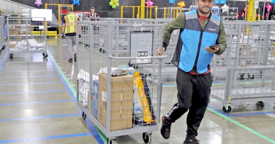 Typically, an Amazon package would move through three types of buildings before hitting the customer’s doorstep: a fulfillment center, a sortation center and a delivery station. At its same-day facilities, Amazon will “take all that and put it under one roof” to deliver hours after a customer places an order, Volk said.