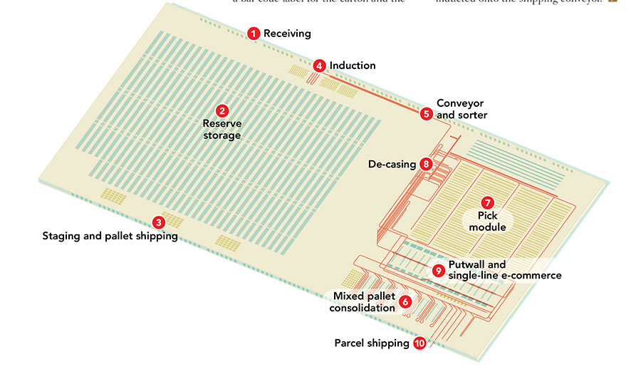In the second step, associates create mixed SKU cartons. In this process, the warehouse management system (WMS) creates a wave of 2,200 orders, which represents the number of storage locations in a light-directed putwall area (9). A sliding shoe sorter diverts the shoes to a chute that leads to the right putwall location for that order. The shoes are queued on carton flow rack. When all of the pairs for a carton are in a location, a light alerts an associate that the order is ready to be packed. The system prints a bar code label for the carton and the associate loads the shoes into the carton.