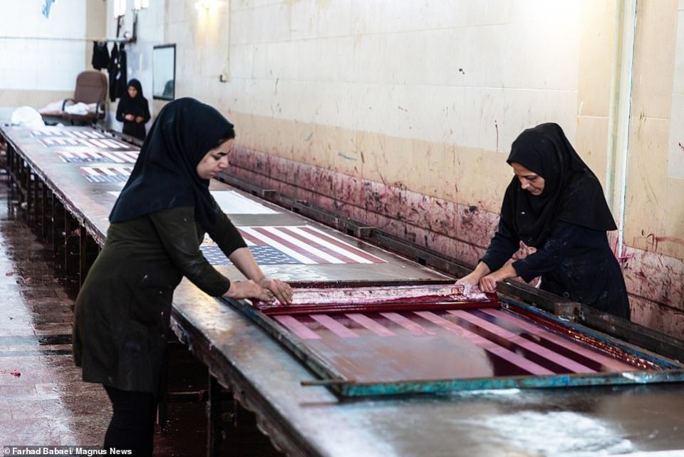 These fascinating photos show inside the largest flag factory in Iran where US, UK and Death to Israel flags are made for burning in protest at Western sanctions.