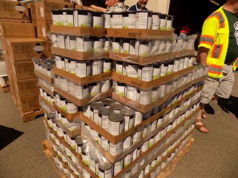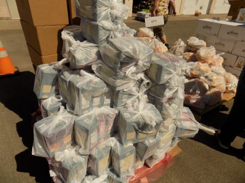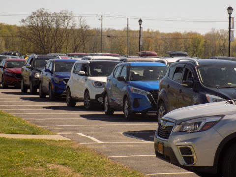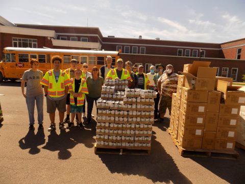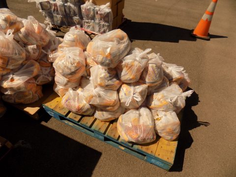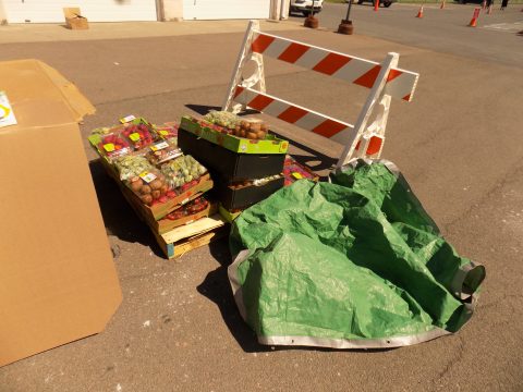 We arrived to find a team of volunteers, from students at the school to church members, to members of the Ovid community arranging the food for pickup. The food distribution was scheduled to begin at 3:45 p.m. and precisely at 3:45, over a hundred cars started to roll through the parking lot, some picking up shares for their families, others picking up shares for people they know.