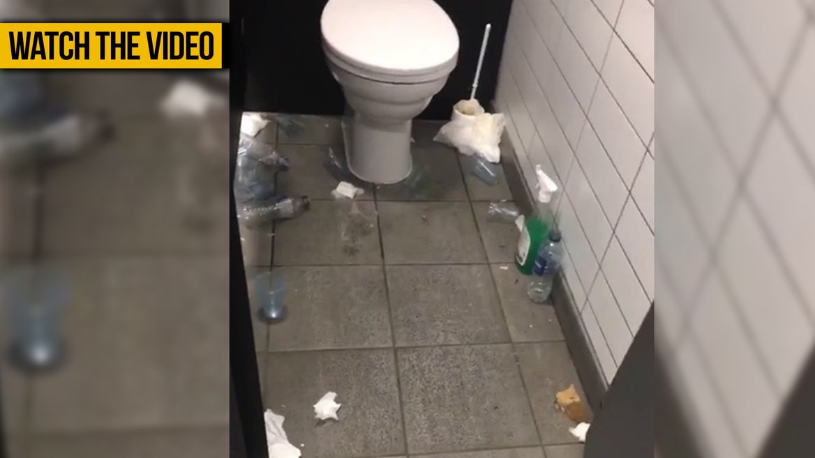 Footage sent to LancsLive, reveals dirty toilets with toilet paper strewn in cubicles and on sinks.