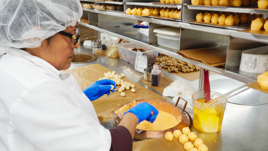 In a quiet room adjacent to the bustling factory floor, half a dozen employees — most with decades of experience — are busy tossing small lumps of candy, one at a time, into colorful pots of warm fondant. With a flick of the wrist, they retrieve the candy with a curved utensil, set it on a tray, and draw a design on top with the excess fondant — all in one swift motion. Within seconds, the candy hardens.