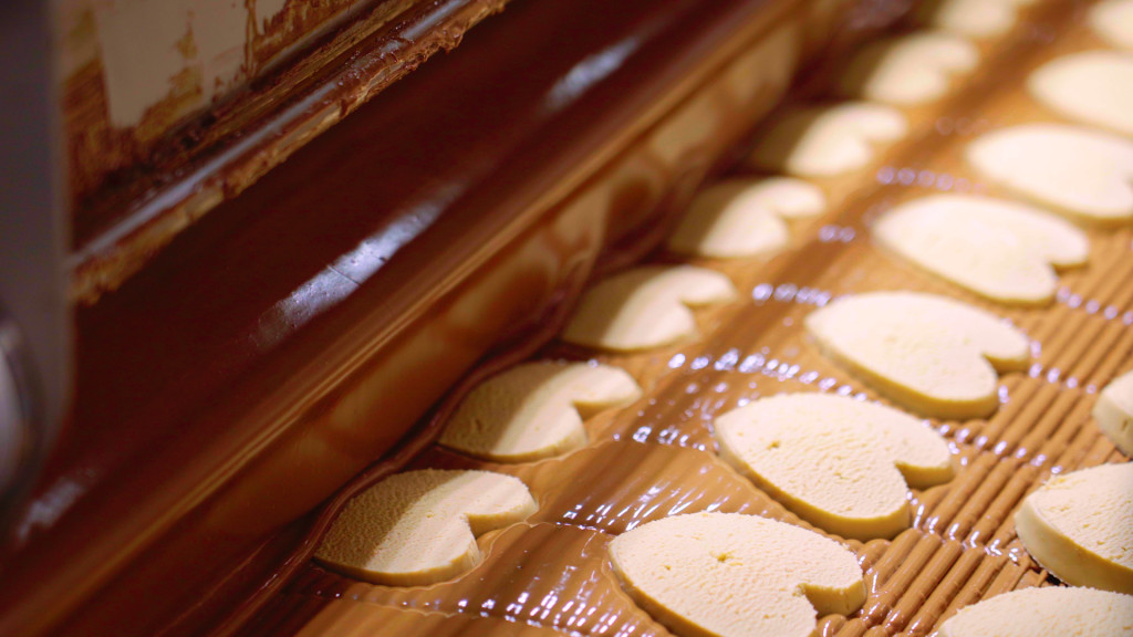 In a room that could easily swallow two football fields, candies pass through solid curtains of molten chocolate, then chilled tunnels that solidify the coating, and then more chocolate, pumped out of 50,000-pound tanks. The delicious smell of that chocolate — delivered by tanker truck from chocolate maker Guittard in Burlingame — finds its way into every nook and cranny of the facility, and even wafts into the office spaces upstairs.