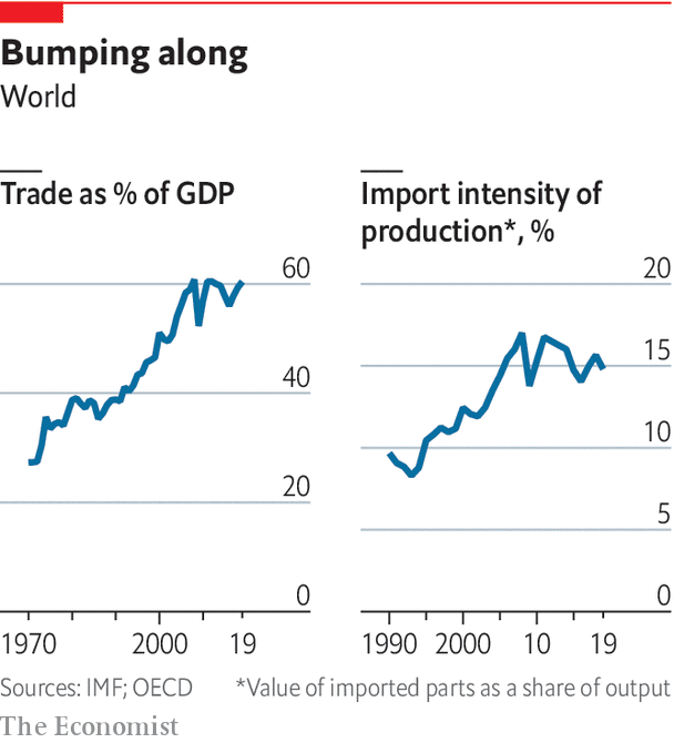 The logic of turning inward in response to the pandemic is shaky. A recent working paper by Barthélémy Bonadio of the University of Michigan and three co-authors studies 64 countries and finds that one-quarter of the drop in GDP this year was transmitted along supply chains, but that reshoring production would not have reduced the damage. Mr Miroudot distinguishes a supply chain’s robustness (the ability to keep working through a crisis), from its resilience (the ability to bounce back from one). The history of supply chains is that they are not robust but they are resilient, because companies are quick to find workarounds. Their robustness could be improved, but not by repatriating production, since disaster can strike at home as well. Had New York been the centre of mask production when covid-19 struck, the result would have been a “real big mess”, argues Shannon O’Neil of the Council on Foreign Relations.