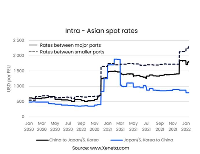 According to Xeneta, in the first half of January, spot rates from the main Chinese ports to the main Japanese and South Korean ports have risen back above USD 1 800 per FEU. This comes after spot rates on this trade had been mostly flat in 2021 at USD 1 400 (up from an average of USD 640 in 2020).