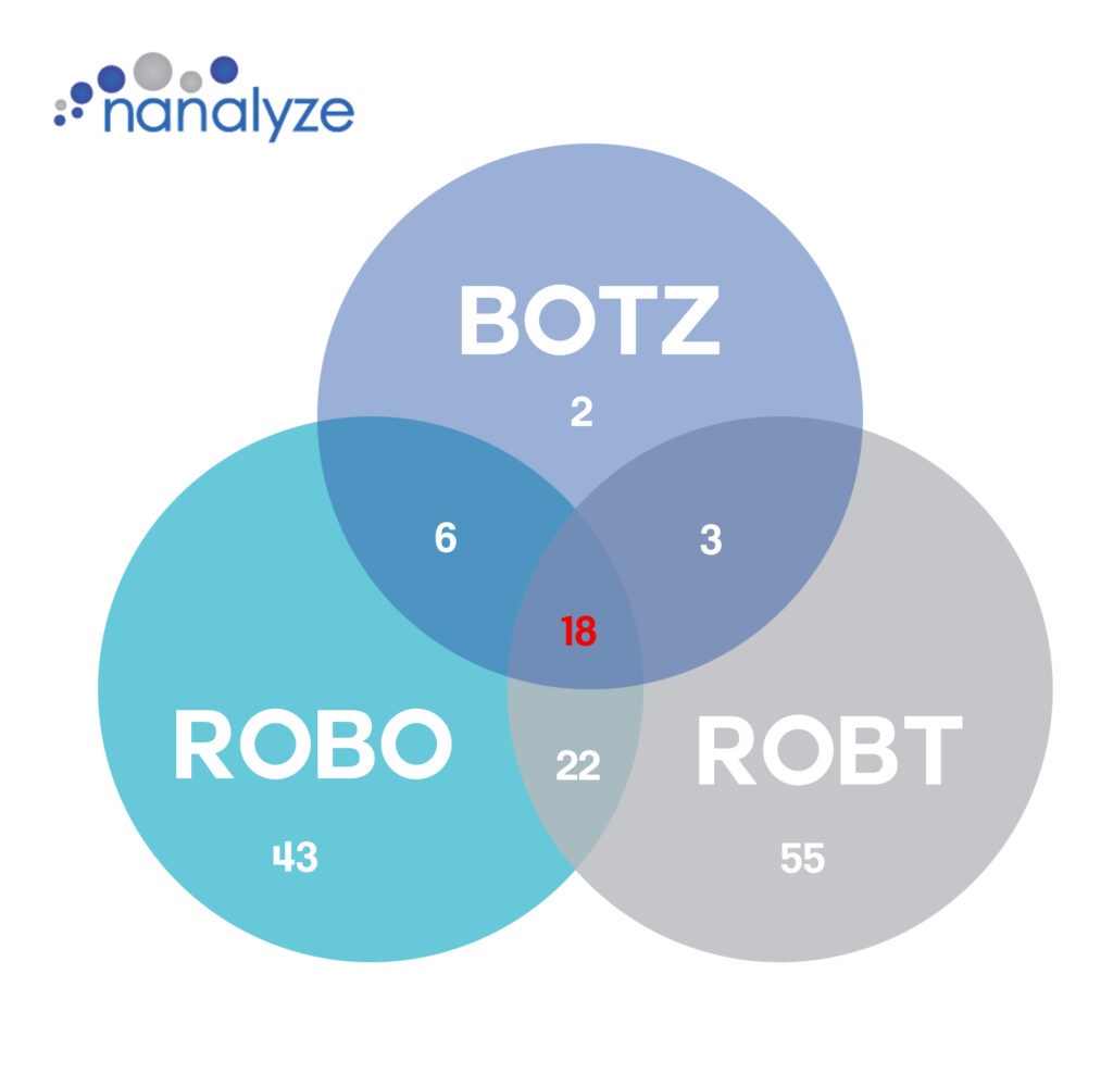 In addition to the many robot stocks we’ve found during our research there are also a number of thematic ETFs out there that offer varying degrees of exposure to robotics. The problem is that most of these robotics ETFS can’t agree on which companies to include. Just take a look at the overlaps between three popular robotics ETFs – BOTZ, ROBT, and ROBO: