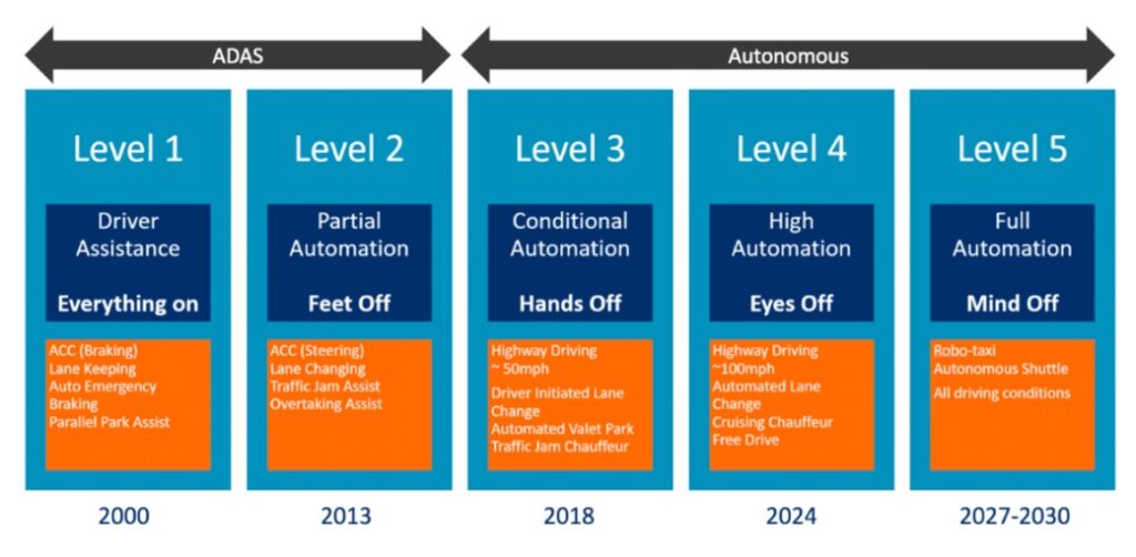 Different levels of autonomy help us understand how driverless cars will work and what is needed to ensure safe and dependable operation. Here are the different levels of autonomous vehicle development courtesy of IEE Spectrum: