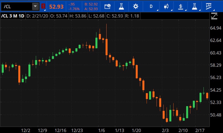 Chart of the Day: Hot Oil Cooling. Despite the risk-off mood among investors on Thursday, oil—which is generally considered a riskier asset and often falls when traders flock to safe-haven investments—gained ground. CME Crude Oil Futures (/CL) got a boost from an Energy Information Administration report that showed weekly inventories rose much less than expected. Friday morning, however, is a different story—crude now seems to be joining the risk-off parade amid fresh coronavirus fears. Data source: CME Group. Chart source: The thinkorswim® platform from TD Ameritrade. For illustrative purposes only. Past performance does not guarantee future results.