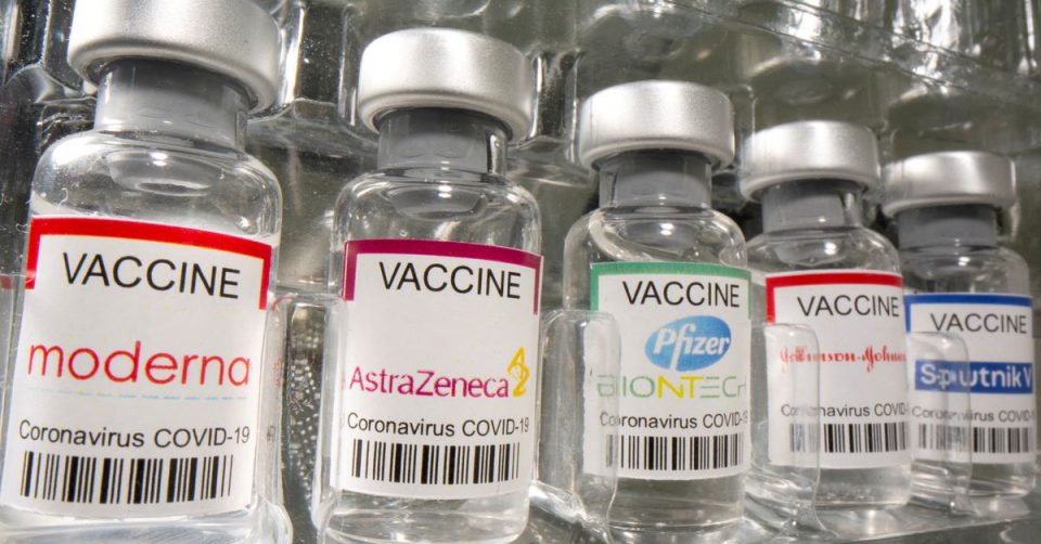 Vials labelled “Moderna, AstraZeneca, Pfizer – Biontech, Johnson&Johnson, Sputnik V coronavirus disease (COVID-19) vaccine” are seen in this illustration picture taken May 2, 2021. REUTERS/Dado Ruvic/Illustration/File Photo