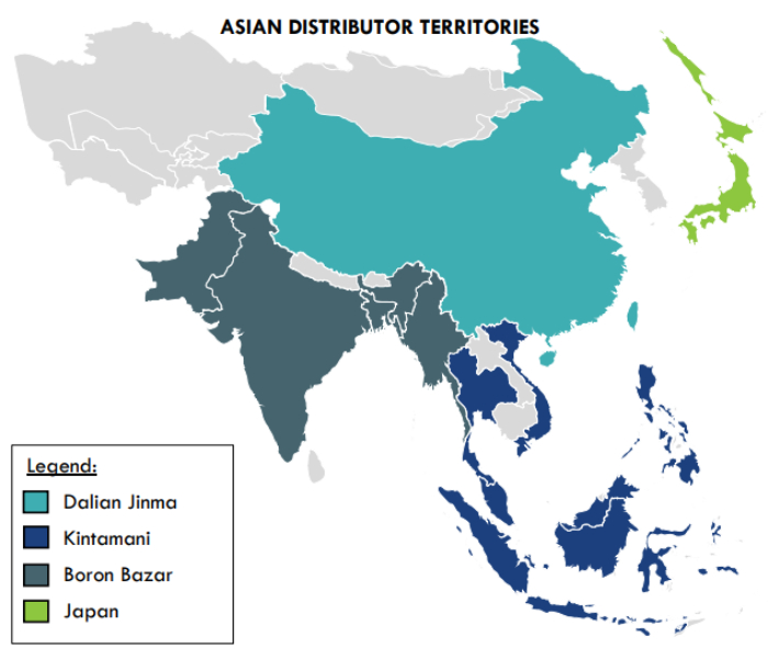 The three-year boric acid distribution and sales agreements were signed with Kintamani Resources Pte Limited for the territories of Malaysia, Indonesia, Singapore, Thailand, Vietnam and the Philippines and with Boron Bazar Limited for the territories of Bangladesh, India, Pakistan and Myanmar.