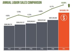 The last fiscal year was the first time sales topped the $400 million mark. The pandemic was credited for the increase in the 2020 fiscal year, its impact is likely behind the continued booze buying in the last fiscal year.