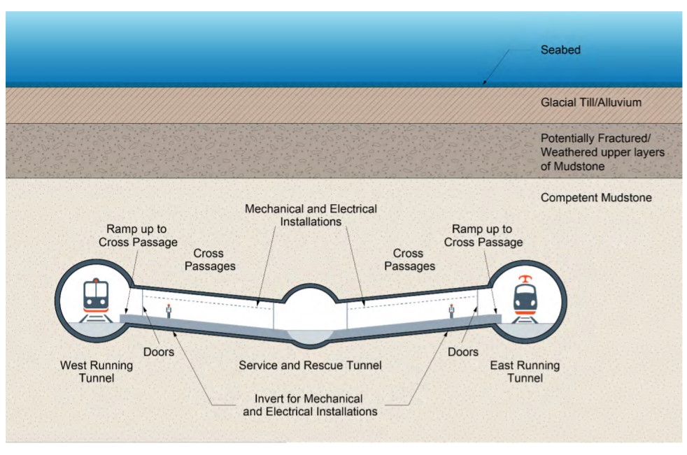 “From each of these shafts, three TBMs (two for the running tunnels and one for the service tunnel) would be launched to bore the marine tunnels and meet somewhere under the North Channel,” the report explains.
