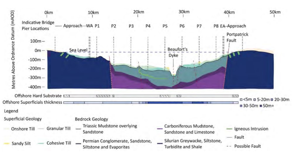 The study says: “There is good rock available for the major bridge foundations. The layer of overlying softer deposits on the seabed varies from zero, where there is exposed rock in places, to perhaps 50m or more. The foundation type and design would need to be able to cope with this variability.”