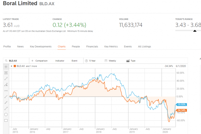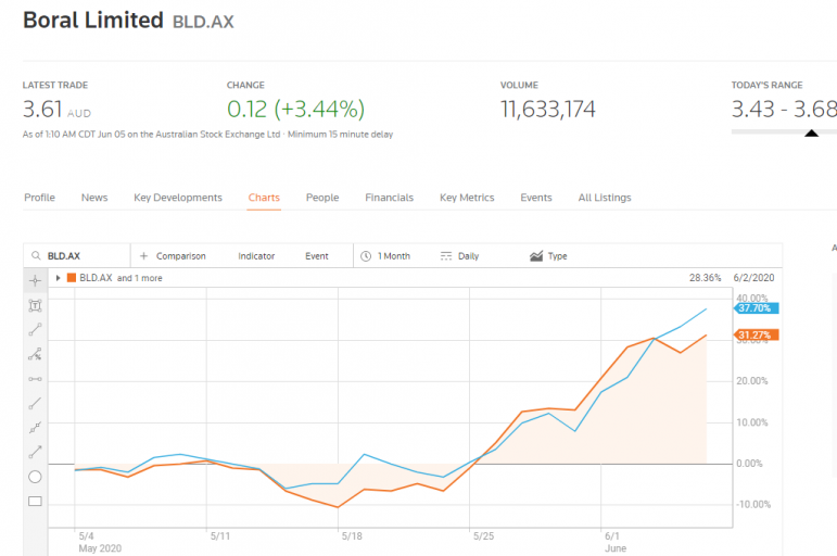 At least risk are the providers of building materials since all projects require materials. It is hard to imagine major construction projects that do not require cement, making Australia’s major cement manufacturers arguably the safest plays in the sector. The two major players on the ASX – Boral Limited (BLD) and ADBRI Limited (ABC) – slumped as the impact of the COVID-19 pandemic began to become apparent but have rallied along with the rest of the ASX over the last month. ADBRI is the new name for the more familiar Adelaide Brighton as of 19 May of 2020. From the Reuters financial website: