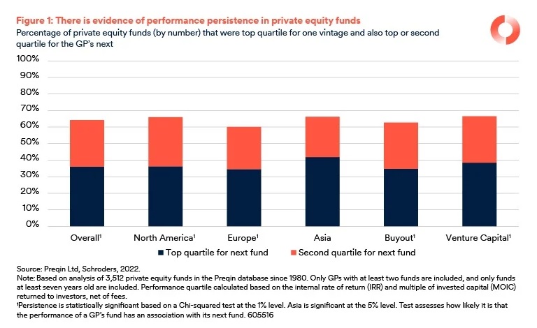 This is according to Schroders Capital’s analysis of 3,512 PE funds raised since 1980 (only GPs with at least two funds are included, and if the funds have a track record of at least seven years, as performance of younger funds is still fluctuating and not definitive).