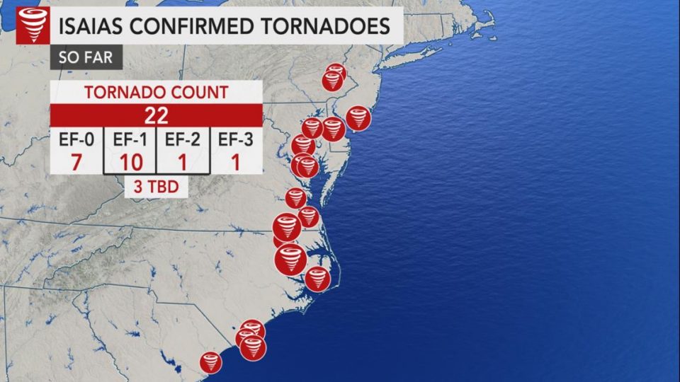 Nearly two dozen tornadoes have been confirmed in the aftermath of Isaias.