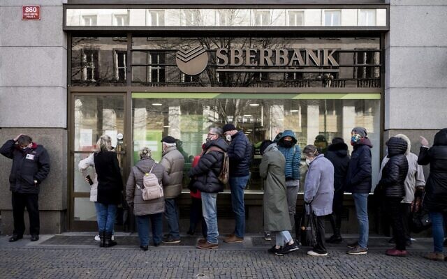 This file photo from February 25, 2022, shows people lining up outside a branch of the Russian state-owned bank Sberbank in Prague to withdraw their savings and close their accounts before Sberbank closed all its branches in the Czech Republic. (Michal Cizek/AFP)