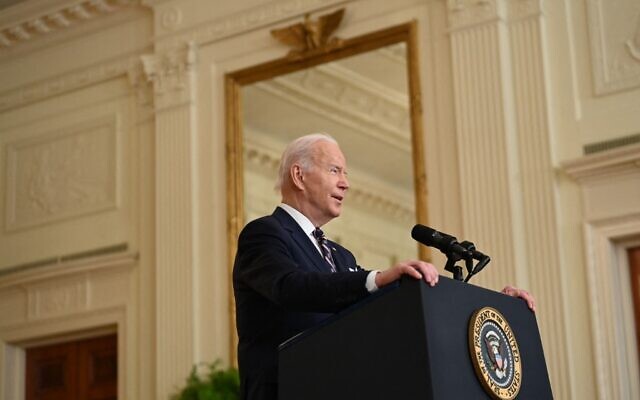 US President Joe Biden speaks in the East Room of the White House about Russian military activity near Ukraine, on February 22, 2022, in Washington, DC. (Brendan Smialowski/AFP)