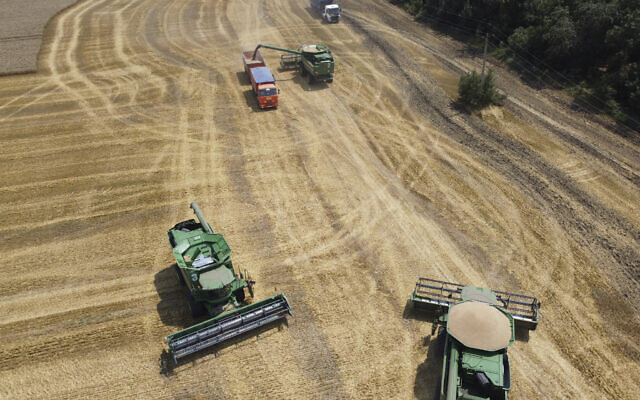 Farmers harvest with their combines in a wheat field near the village Tbilisskaya, Russia, on July 21, 2021. (AP/Vitaly Timkiv)