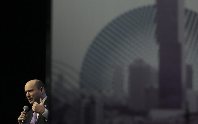 Prime Minister Naftali Bennett speaks at a cyber tech conference in Tel Aviv, March 3, 2022. (AP/Ariel Schalit)