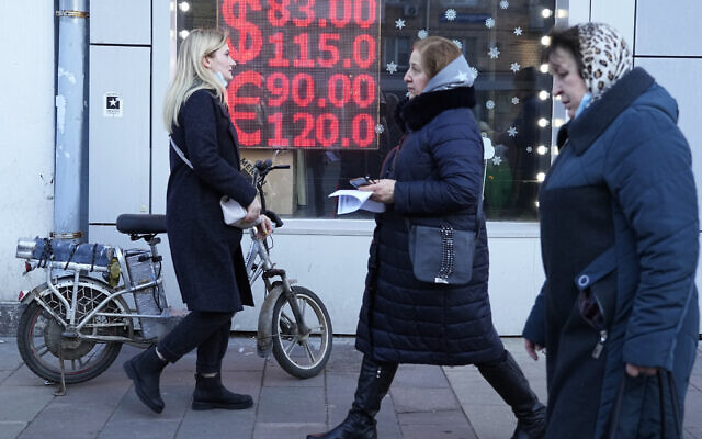 People walk past a currency exchange office screen displaying the exchange rates of US dollars and euros to Russian rubles in Moscow’s downtown, Russia, on Monday, February 28, 2022. (AP/Pavel Golovkin)