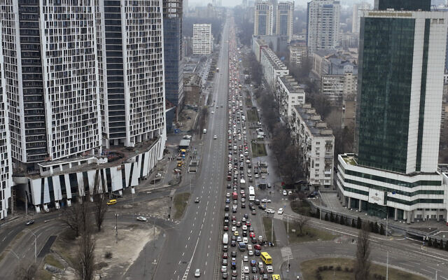 Traffic jams are seen as people leave the city of Kyiv, Ukraine, on Thursday, February 24, 2022. (AP Photo/Emilio Morenatti)