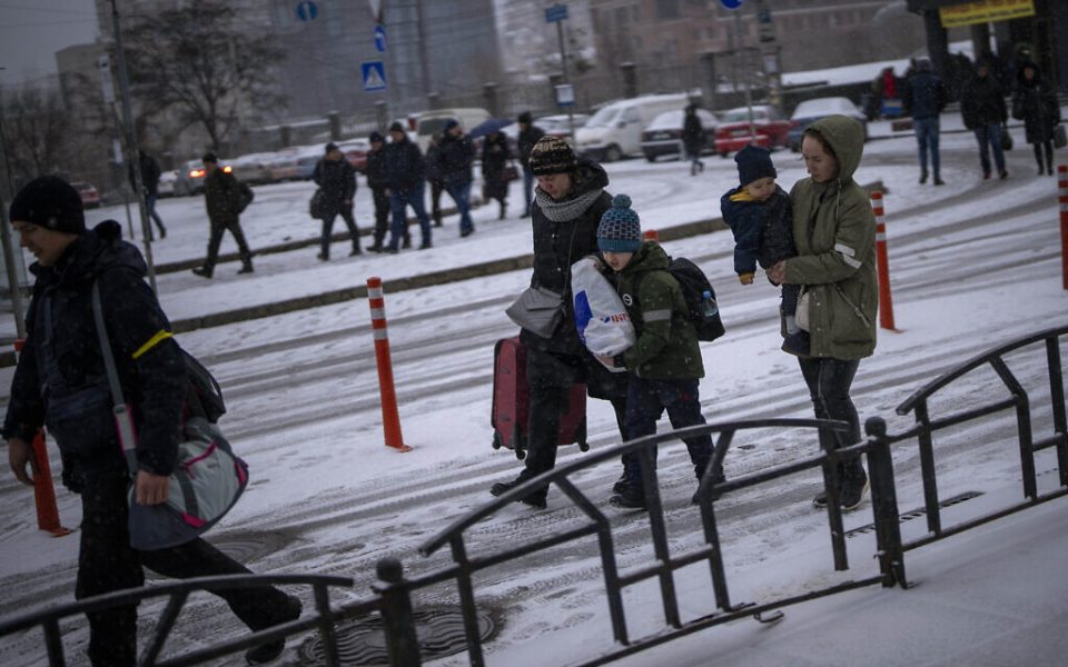Ukrainians prepare to board a bus to Poland at Lviv bus main station, western Ukraine, on March 1, 2022. (AP Photo/Bernat Armangue)