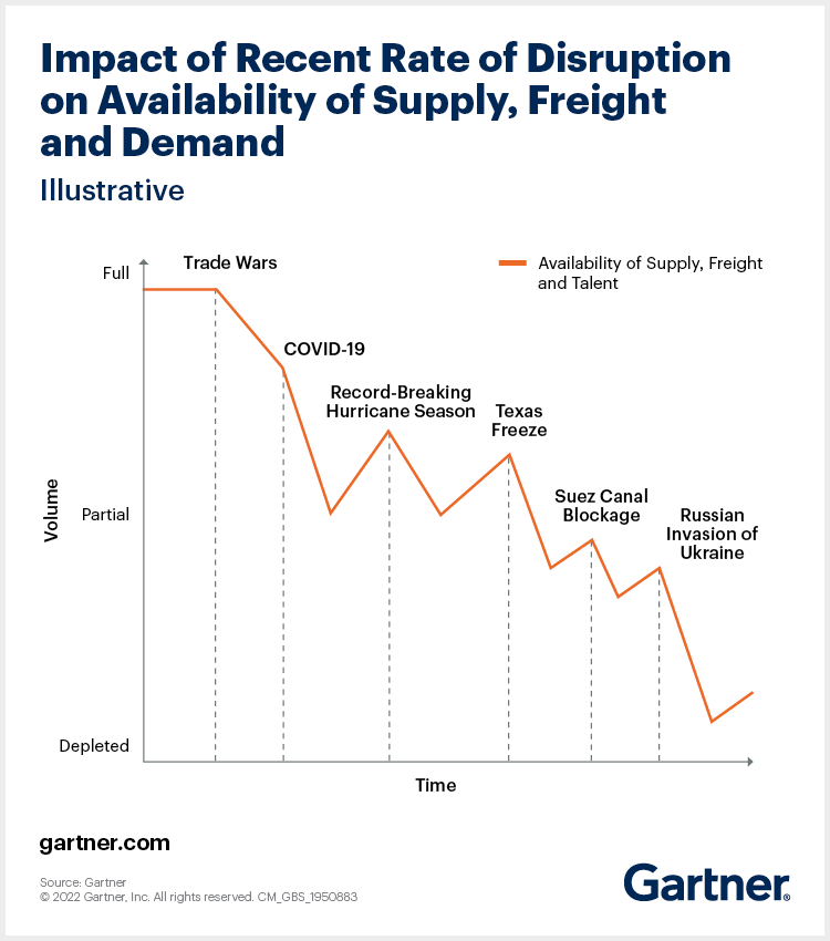 - Redefine the organization’s desired risk appetite to identify strategic decision points. A critical flaw of the supply chain risk management strategy pre-2019 assumed that supply chains would have the ability to recover from any single high-impact disruption before the next one occurred. The past three years have demonstrated how consequential that assumption has been. Supply chain leaders must reevaluate their risk appetite and adjust to a level that is appropriate to the current environment.