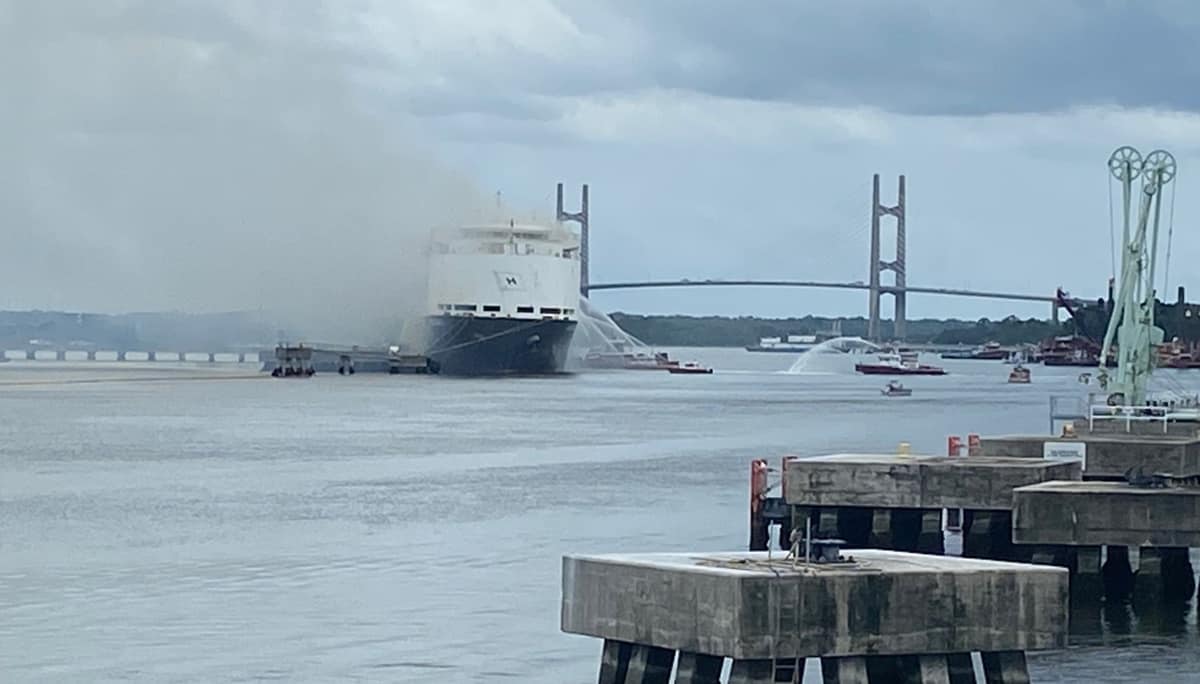 Smoke continued to billow from the Höegh Xiamen Friday afternoon, 24 hours after a fire was reported aboard the vehicle carrier at JAXPORT.