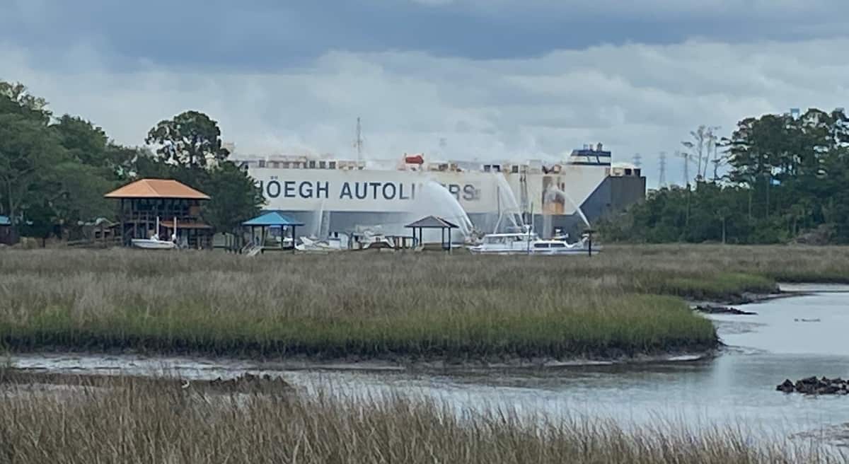 As the smoke mixed with low-hanging rain clouds Friday afternoon, boats sprayed continuous jets of water onto the Höegh Xiamen. According to local television news, fire crews were “working to save the integrity of the cargo ship to help contain any pollution from getting into the ocean.”