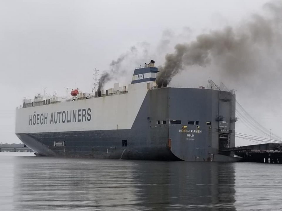 Smoke continued to billow from the Höegh Xiamen Friday afternoon, 24 hours after a fire was reported aboard the vehicle carrier at JAXPORT.