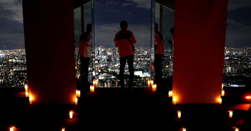 Visitors take photos with Tokyo’s night view during “totally dark time” event, in which all electric lights are out and candlelight is used instead, at Sunshine City’s Observatory after COVID-19 controls were eased, in Tokyo, Japan, October 15, 2021. REUTERS/Kim Kyung-Hoon